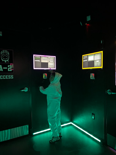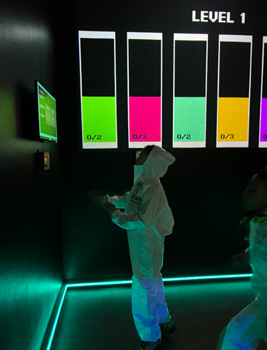 The direct experience is their beat-the-bomb mission. You are given hazmat-type suits and will navigate through four rooms with 10-minute games accumulating time. The last room is the paint “bomb,” which sprays you all with colorful foamy paint if you fail to disarm it.