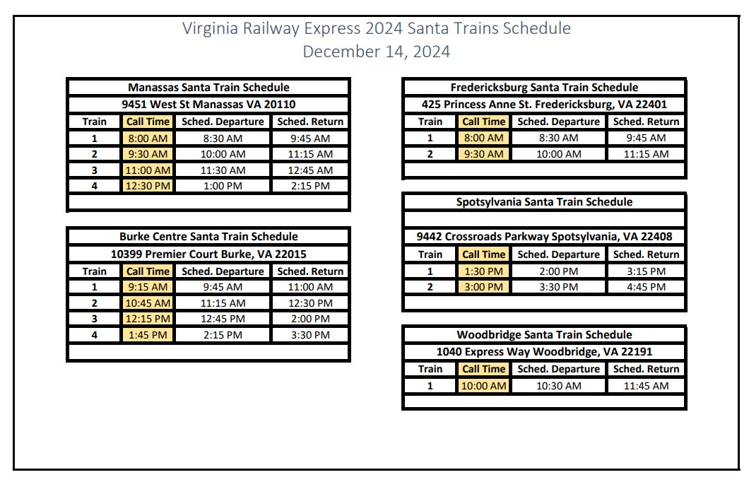 The VRE Santa Train Experience is a magical one-day holiday event on December 14, 2024! Tickets go on sale Monday, December 2 (10am-12pm) at the Woodbridge, Manassas, Spotsylvania, and Fredericksburg Visitor Center. Online tickets will be on sale on Tuesday, December 3 (10am) via Eventbrite (until sold out). All passengers, regardless of age, require a ticket!