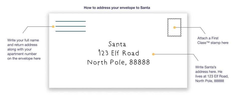 - Make sure to address your letter to: Santa 123 Elf Road North Pole, 88888