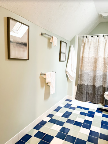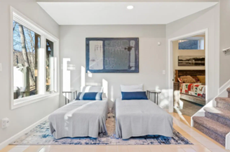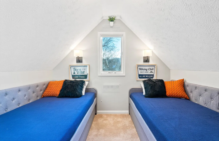 Now the upper level— our kids had this whole floor for themselves. It features two bedrooms with one full-size bed, and the other room has two twin-size beds. They also had a lovely bathroom as well. So, we were all very comfortable in our own little space area, which is a plus when you are traveling with groups of friends and family.