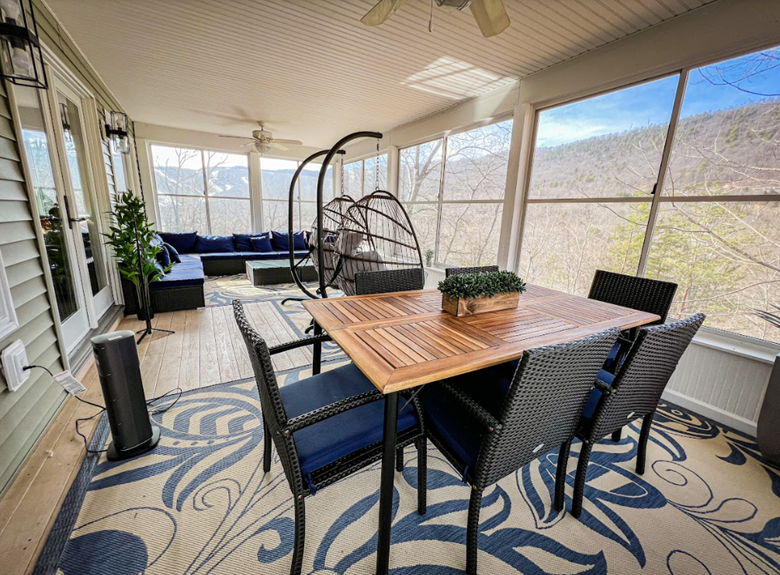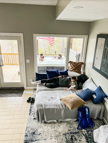 Okay, moving on to the main level— My husband and I had this floor to ourselves. I know you’re probably wondering where our kids are. On the main level, you will find the kitchen area, laundry room, and desk area (for those that need to work remotely). There is also a second master suite, dining area, living room, a very nice outdoor deck with rocking chairs, tables, and outstanding views of the Massanutten Resort Slopes, and two additional decks with seating areas and fire pits. I set up the Pack N-Play in our room for our baby Max to sleep comfortably, and we brought heavy blankets from home.