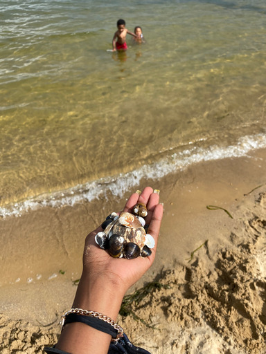 My jaw dropped to the sandy floor when I found fossils and shark teeth lying around the shore. This part of the beach was a 1.2-mile trail away. My kids were fascinated beyond belief, as you can see in the picture below.